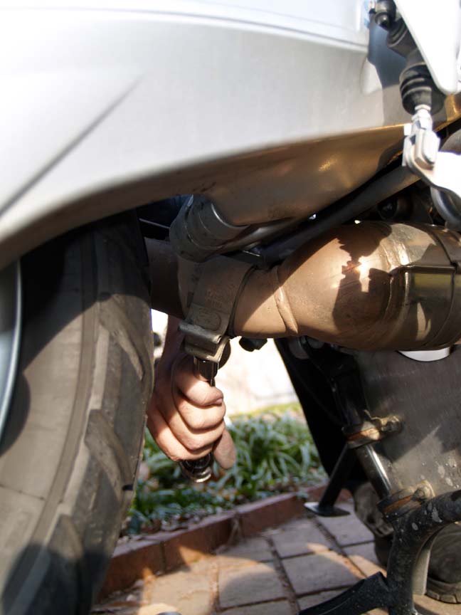 The muffler must come off to allow clearance to the lower shock bolt, and easier removal of the shock. Loosen the muffler clamp.